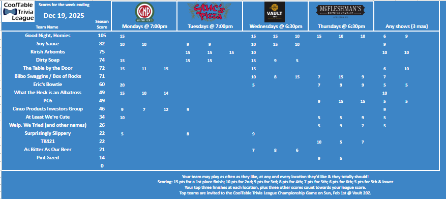 After the season, the top ten teams will be invited to the CoolTable Trivia League Championship Game on February 1st.